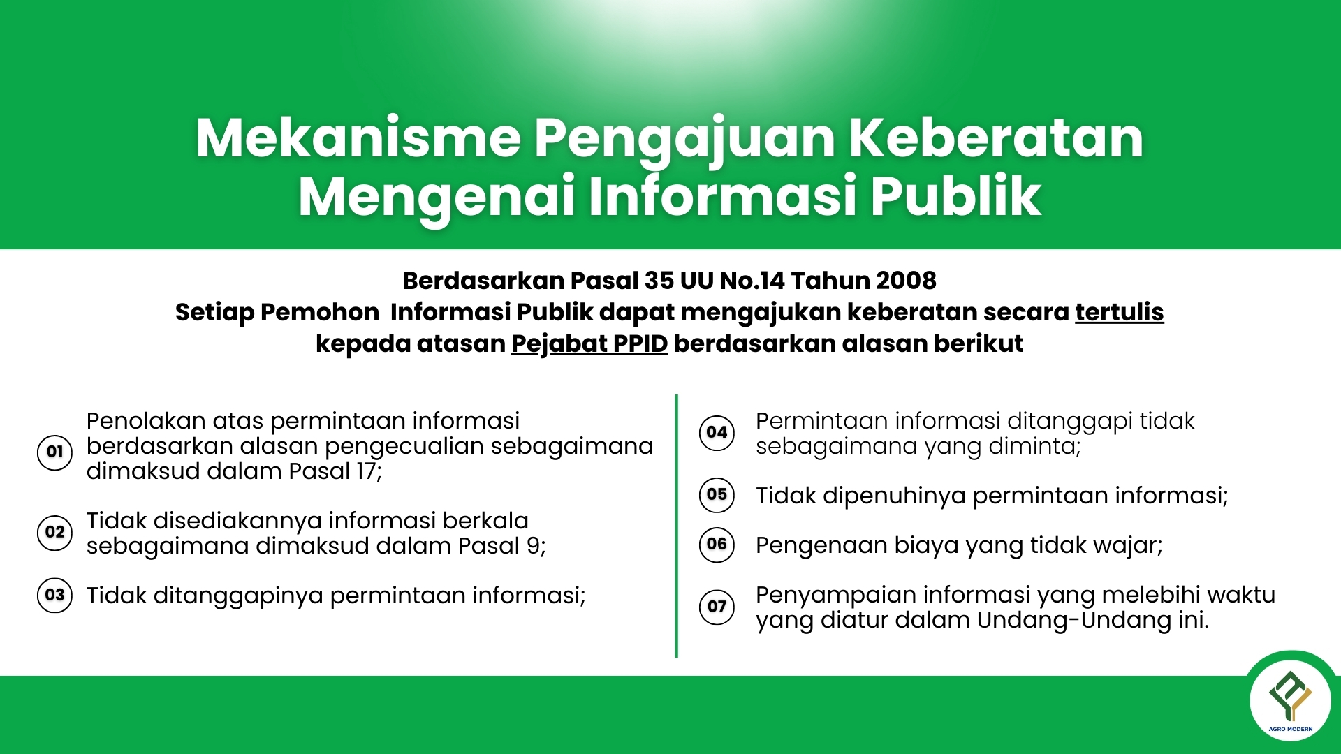 Setiap pemohon informasi publik dapat mengajukan keberatan secara tertulis kepada atasan Pejabat Pengelola Informasi dan Dokumentasi dengan alasan sebagaimana ditetapkan dalam pasal 35 Undang-Undang Nomor 14 Tahun 2008. Keberatan diajukan oleh Pemohon Informasi Publik dalam jangka waktu paling lambat 30 (tiga puluh) hari kerja setelah yang bersangkutan menemukan alasan keberatan.